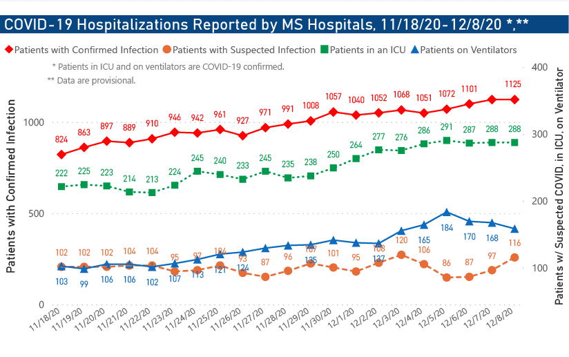The number of Mississippians hospitalized for the virus as of 6 p.m. Tuesday, Dec. 8, was 1,241. The number includes 1,125 with confirmed cases of COVID-19 and 116 people with suspected but unconfirmed cases. Of those with confirmed infections, 288 were critically ill and in intensive care units and 159 were on ventilators.