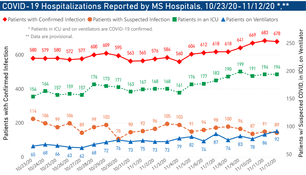 The number of Mississippians hospitalized for the virus as of 6 p.m. Thursday, Nov. 12, was 774, about 65% of the late July peak of about 1,200. The number includes 678 with confirmed cases of COVID-19 and 89 people with suspected but unconfirmed cases. Of those with confirmed infections, 194 were critically ill and in intensive care units and 92 were on ventilators.