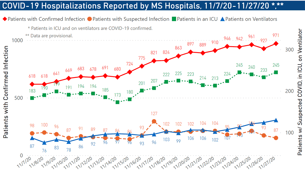 The number of Mississippians hospitalized for the virus as of 6 p.m. Friday, Nov. 27, was 1,058, about 88% of the late July peak of about 1,200. The number includes 971 with confirmed cases of COVID-19 and 87 people with suspected but unconfirmed cases. Of those with confirmed infections, 245 were critically ill and in intensive care units and 130 were on ventilators.