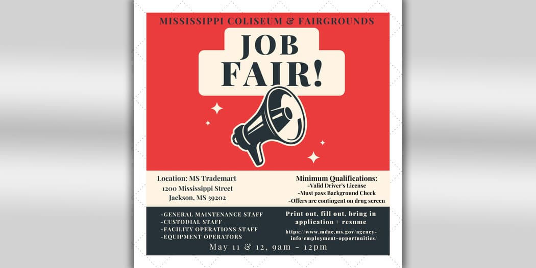 The job fair for positions available at the Mississippi State Fairgrounds includes general maintenance, custodial, equipment operators and facility operations. Those interested in attending are required to bring a completed application and current resume. To find an application, visit www.mdac.ms.gov/agency-info/employment-opportunities.