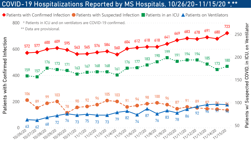 The number of Mississippians hospitalized for the virus as of 6 p.m. Sunday, Nov. 15, was 807, about 67% of the late July peak of about 1,200. The number includes 723 with confirmed cases of COVID-19 and 84 people with suspected but unconfirmed cases. Of those with confirmed infections, 180 were critically ill and in intensive care units and 96 were on ventilators.