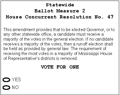 Ballot measure two will determine how votes are counted for the statewide offices. Mississippi law says that a candidate must carry the majority of the state’s 122 house districts, not just get a majority of votes. Critics say the law dates to the bad old Jim Crow days and is designed to disenfranchise African American voters in majority Black districts. If no candidate leaps over both hurdles, the Mississippi House of Representatives gets to decide the winner.