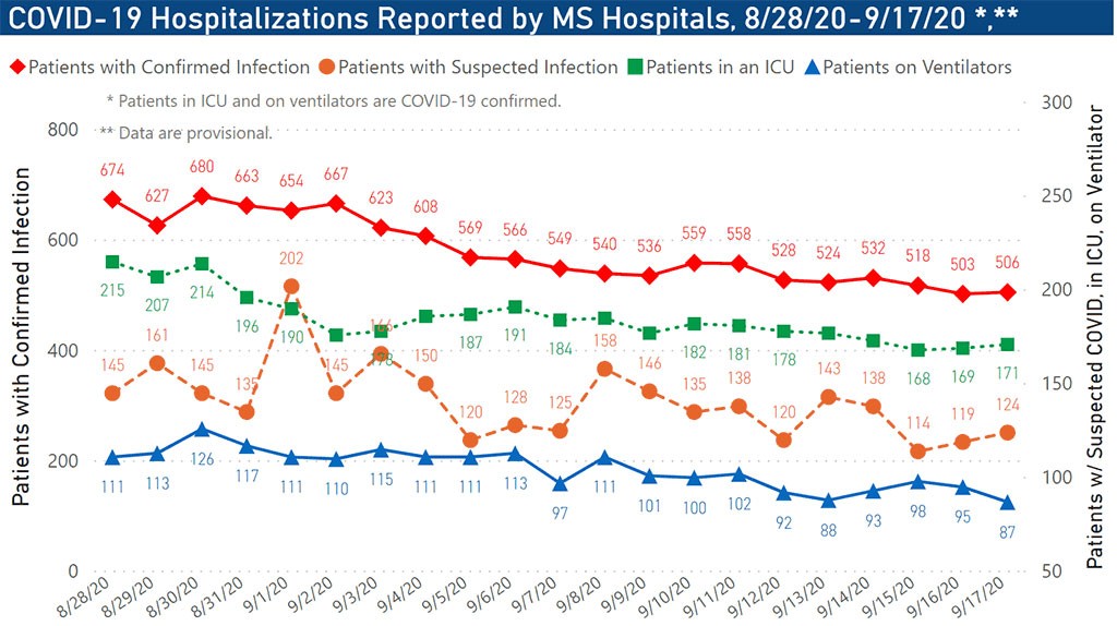 The number of Mississippians hospitalized for the virus as of 6 p.m. Thursday, Sept. 17, is 630, about half of the late July peak of more than 1,200. The number includes 506 with confirmed cases of COVID-19 and 124 people with suspected but unconfirmed cases. Of those with confirmed infections, 171 were critically ill and in intensive care units and 87 were on ventilators.