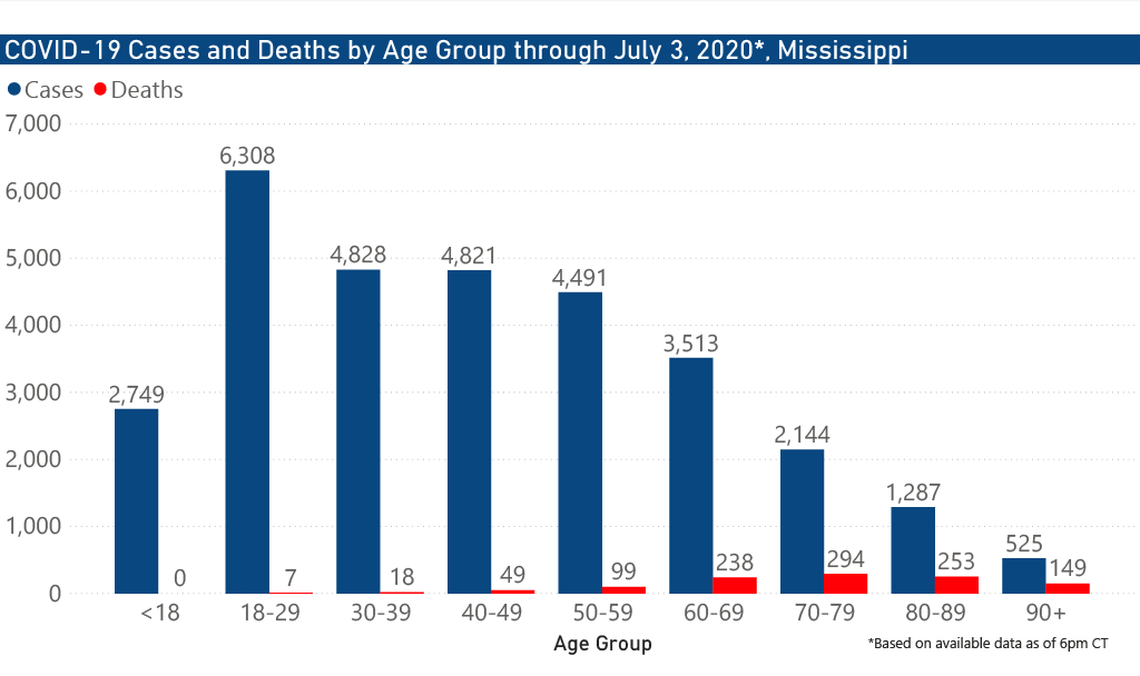 The numbers of deaths can lag new cases by as long as two weeks or more, which may be one reason deaths in the state have not risen dramatically. In addition, most new cases are seen in younger people recently, and they are more likely to survive the virus than those 65 and older. By far, the largest age group reporting cases in Mississippi are young people from 18 to 29 years old, while deaths are seen primarily in those 65 and older.