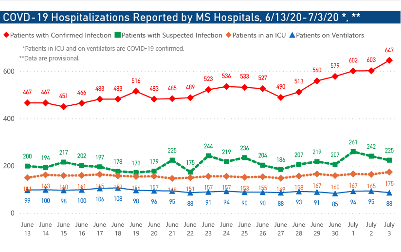 Mississippians hospitalized for the virus as of 6 p.m. Friday, July 3, is 862, including 647 with confirmed cases of COVID-19 (another record high) and 225 people with suspected but unconfirmed cases. Of those with confirmed infections, 175 were critically ill and in intensive care units, and 88 were on ventilators.
