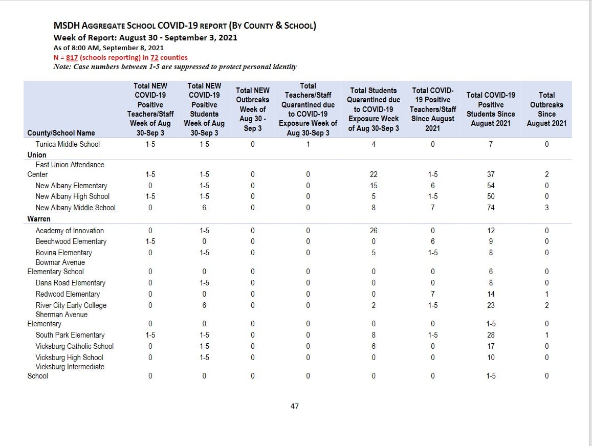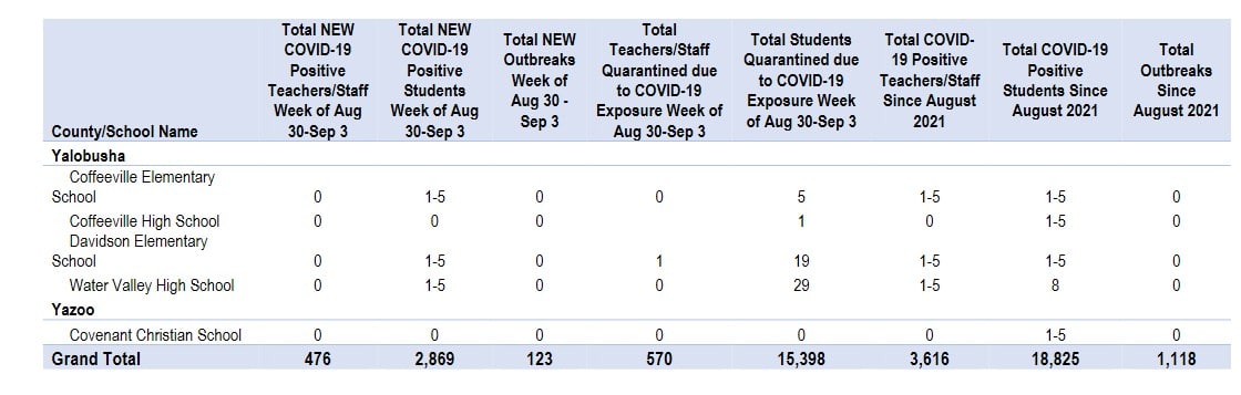 Over 15,000 Mississippi students are in quarantine across the state of Mississippi, according to a weekly report released by the Mississippi Department of Health. The total represents reported positive and quarantined students for the week of August 30 – September 3. As of September 8, at 8 a.m., 817 schools in 72 counties have reported.