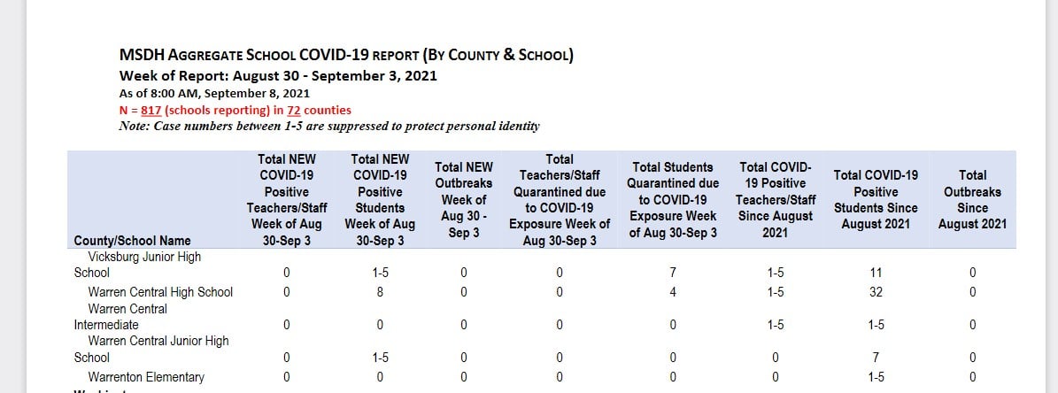 According to the report released by the MSDH, Warren County has experienced positive COVID cases at the following schools: