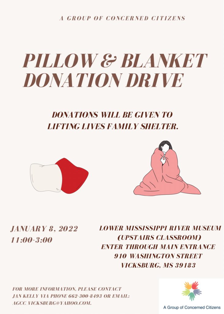 A Pillow & Blanket Donation Drive will be held on Jan. 8 to help supply Lifting Lives Family Shelter. The event is hosted by A Group of Concerned Citizens.