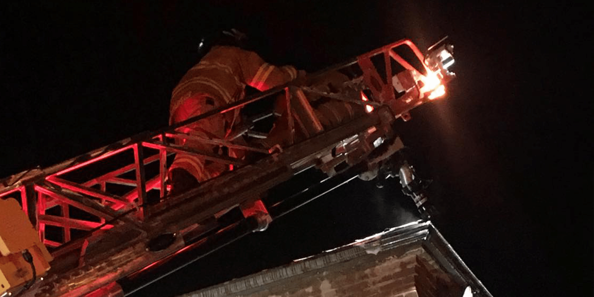 The ladder enabled firefighters to saturate the structure from above and smother any remaining fire remnants with foam.