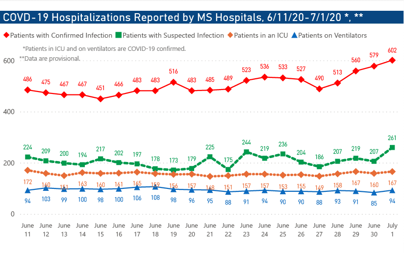 The primary metric concerning state health officials are the numbers of people hospitalized. Mississippians hospitalized for the virus as of 6 p.m. Wednesday, July 1, is 863, including 602 with confirmed cases of COVID-19 (another record high) and 261 people with suspected but unconfirmed cases. June 6, Mississippi had 358 patients with confirmed infections, meaning the numbers have increased by almost 60% in less than a month. Of those with confirmed infections, 167 were critically ill and in intensive care units, and 94 were on ventilators.
