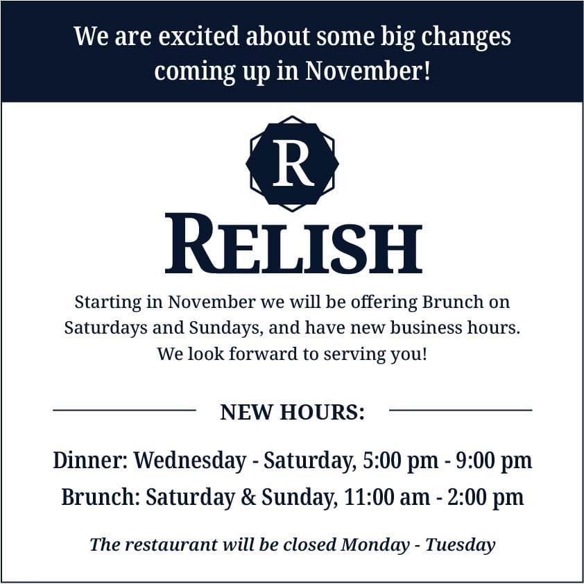 Relish will soon offer brunch on Saturdays and Sundays