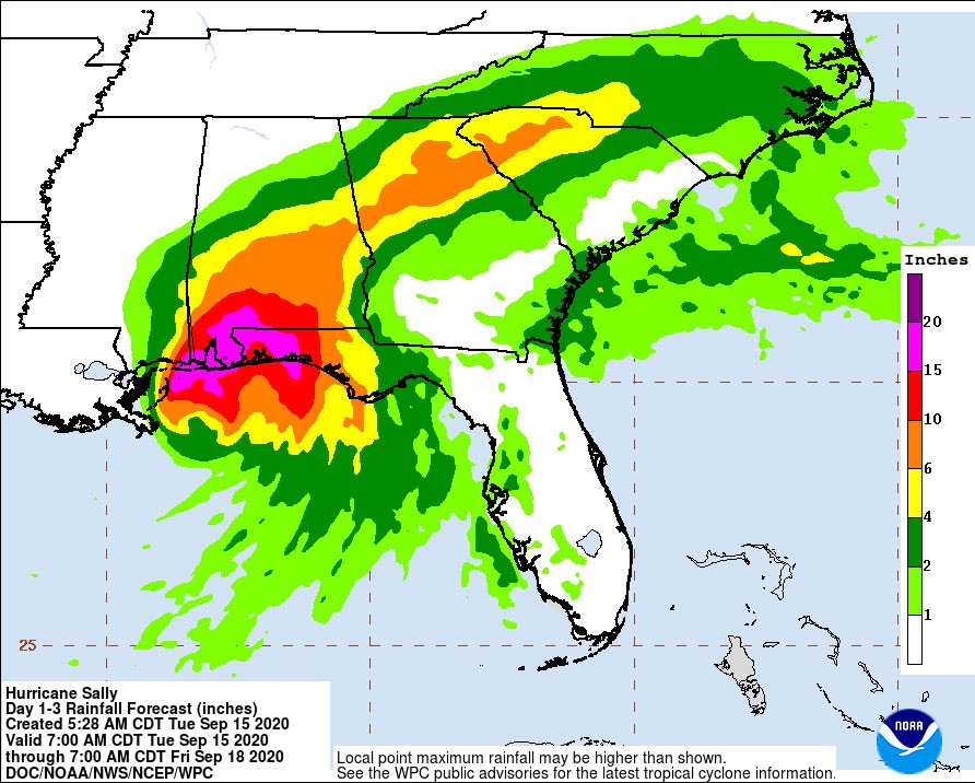 Sally is expected to be a slow-moving system as it approaches land producing 10 to 20 inches of rainfall with isolated amounts of 30 inches along and just inland of the central Gulf Coast from the western Florida Panhandle to far southeastern Mississippi. Historic flooding is possible with extreme life-threatening flash flooding likely through Wednesday. In addition, this rainfall will lead to widespread moderate to major flooding on area rivers.