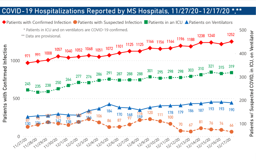 The number of Mississippians hospitalized for the virus as of 6 p.m. Thursday, Dec. 17, was 1,318. The number includes 1,252 with confirmed cases of COVID-19 and 66 people with suspected but unconfirmed cases. Of those with confirmed infections, 319 were critically ill and in intensive care units and 190 were on ventilators.