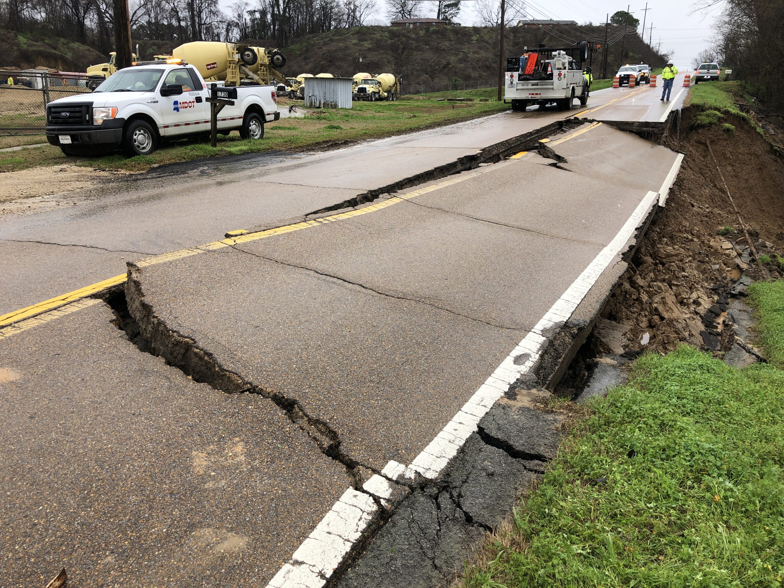 Just east of U.S. 49, State Route 16 remains closed in Yazoo County following a roadway failure because of these heavy downpours, but a slide repair project is underway. The contract was awarded to Riverside Construction Company, Inc., at an amount of $2.1 million. Work is on track to be complete this summer, pending weather.