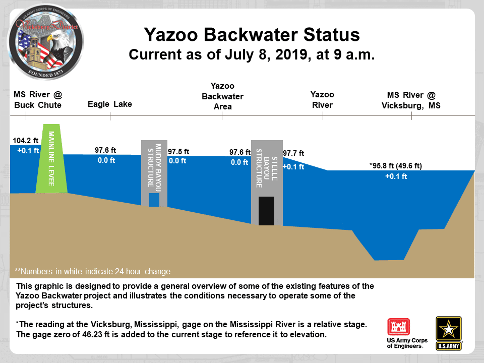 Engineers with the Corps expect water levels in the Mississippi and Yazoo rivers to fall again this week, creating conditions for the gates to re-open. “The Mississippi should start falling tomorrow, and it should take a day or two to go back,” said Drew Smith, USACE Vicksburg District Chief of Water Management, adding that the Corps will reopen the gates “more than likely Thursday, and possibly Friday.”