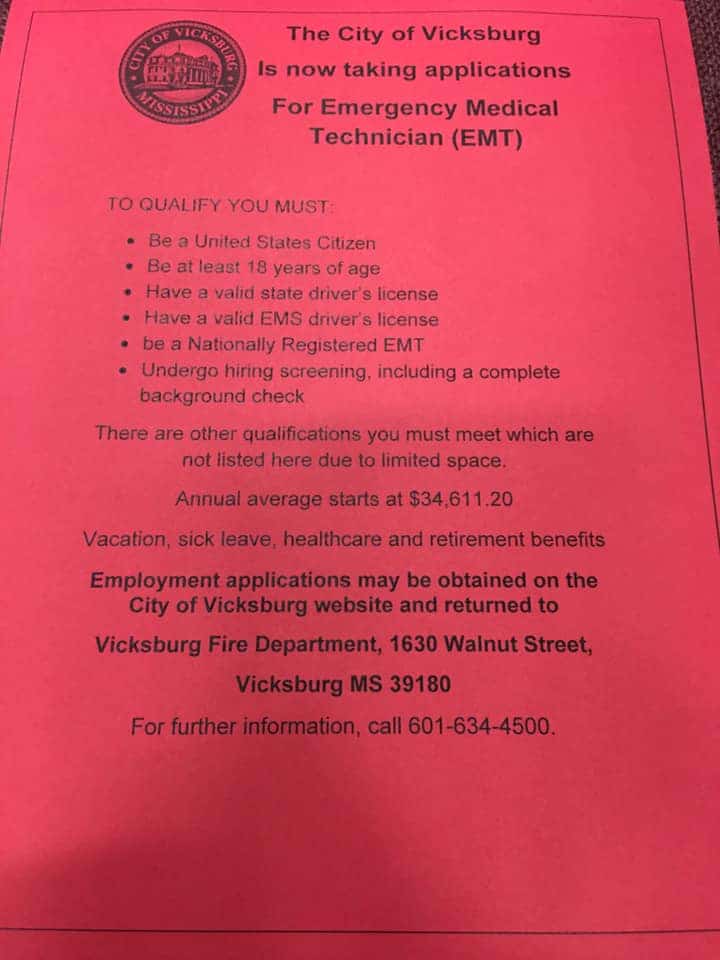 The Vicksburg Fire Department recently posted that the city is now taking applications for Emergency Medical Technicians (EMTs).