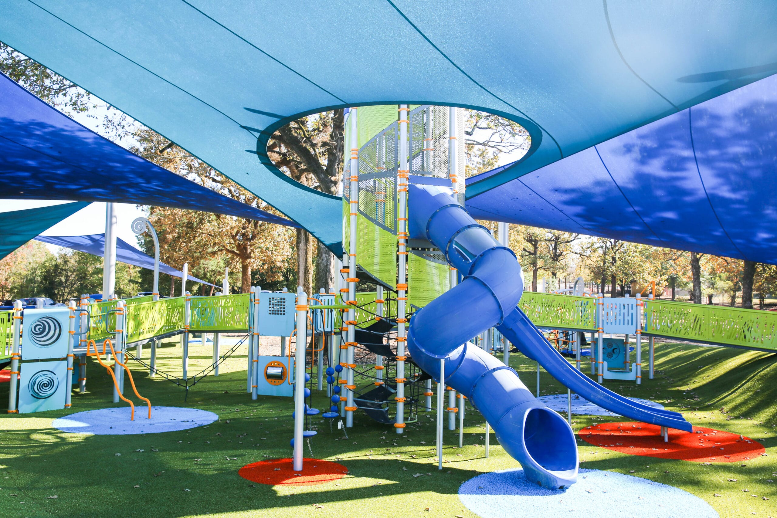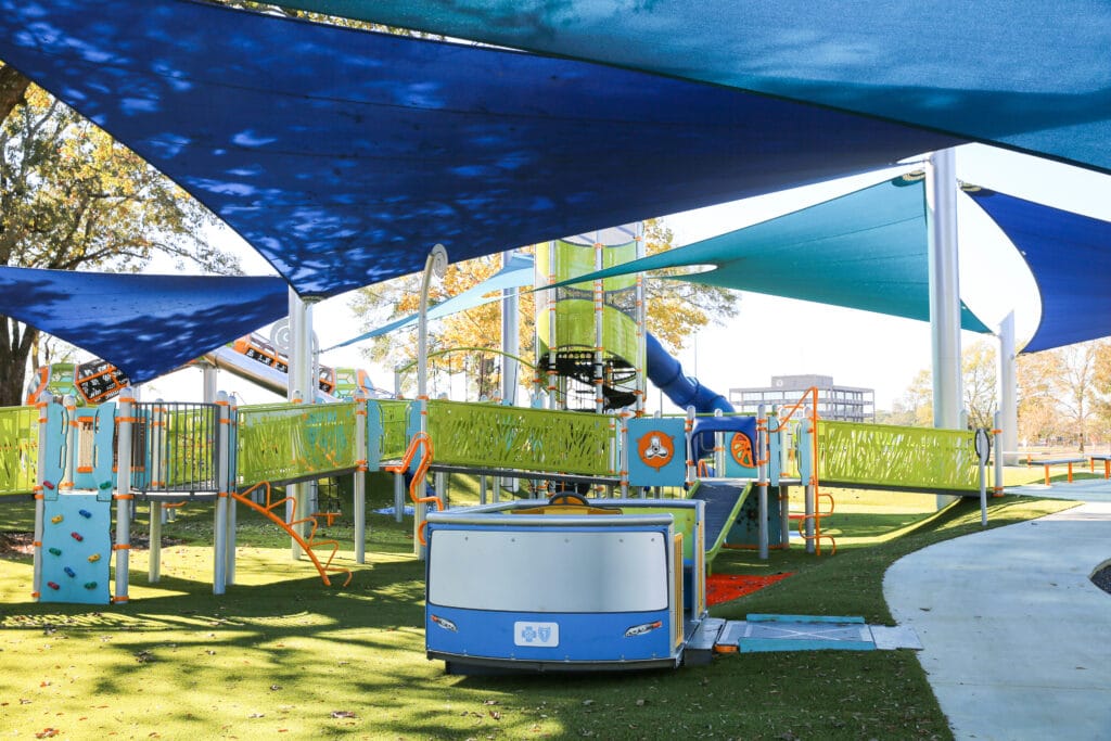The 30,000-square-foot playground is separated into different play areas based on age, for children ages 6 months to 12 years old. The playground features a unique play structure for ages 6-23 months, the Wedra, which is the first play structure in the world with this design. Another feature is the Hedra® Tower, which is designed for children ages 5-12 and is the fourth play structure in the country with this design. Shade structures cover 75 percent of the playground, making the area below up to 30 degrees cooler for year-round outdoor play.