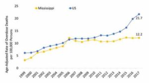 The rate of drug overdose deaths has not significantly changed in Mississippi over the past several years, and in contrast with national statistics, the rate is deceptively low.