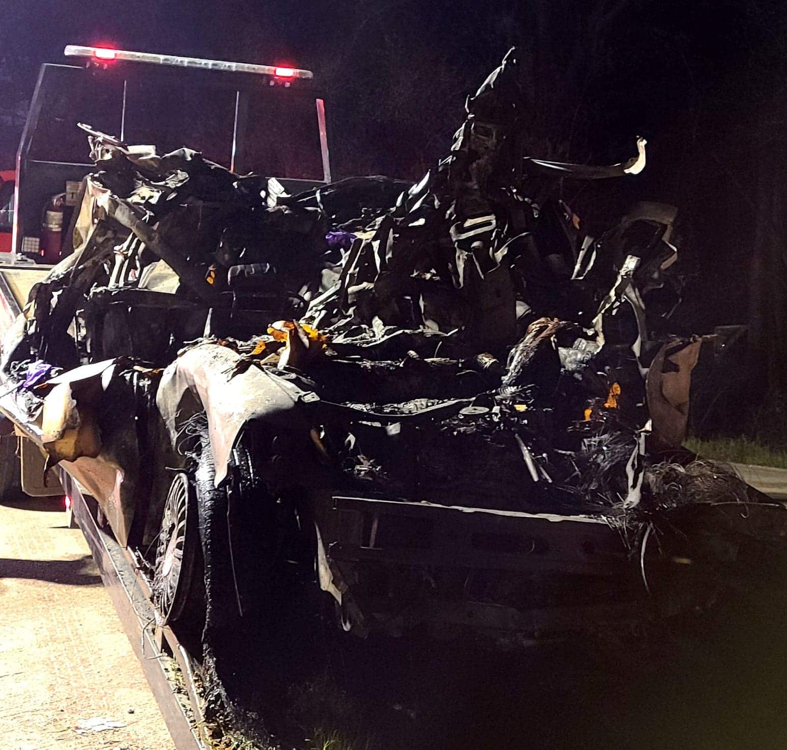 The mangled and still burning wreckage where 3 people perished (photo by David Day)