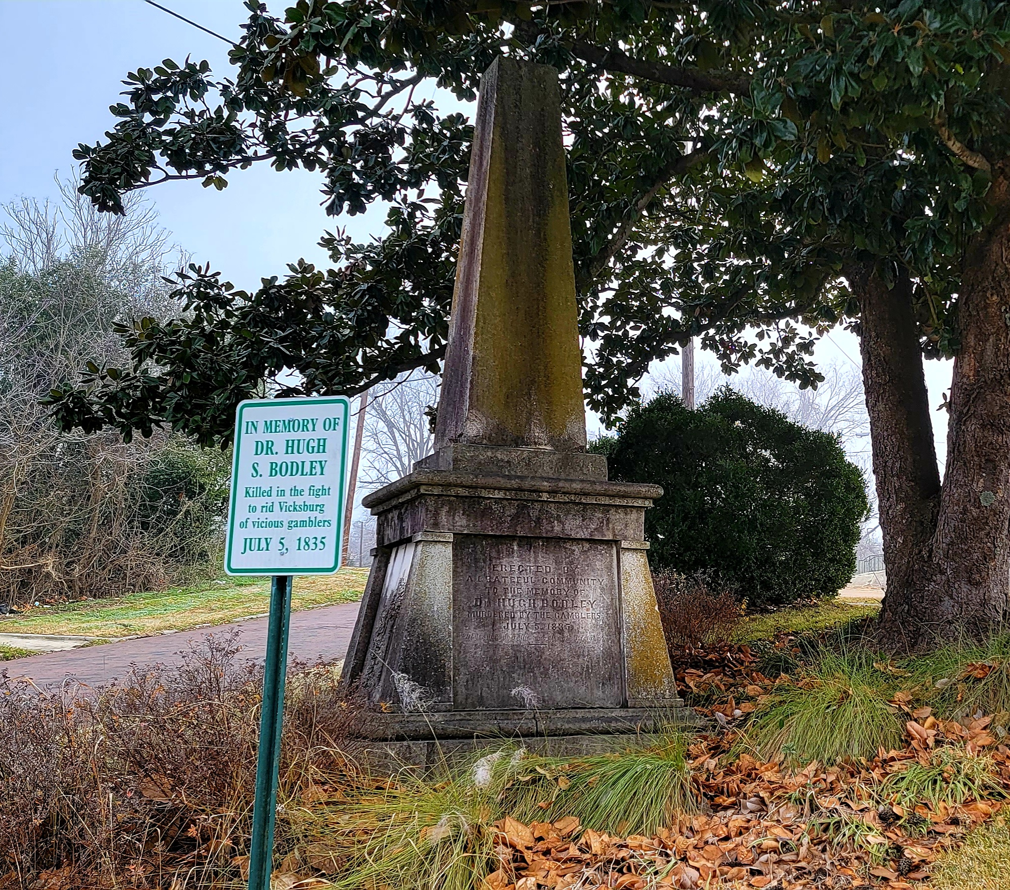 “Erected by a grateful community to the memory of Dr. Hugh Bodley, Murdered by the gamblers July 5, 1835, while defending the morals of Vicksburg” Photo by David Day, Feb 5, 2022.