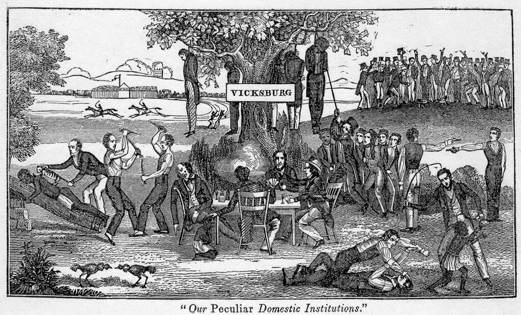Photo from the Library of Congress (2)that highlights the barbaric habits of Americans in the 1830s. Note that at the center of the work is the hanging of 5 vicious gamblers in Vicksburg.