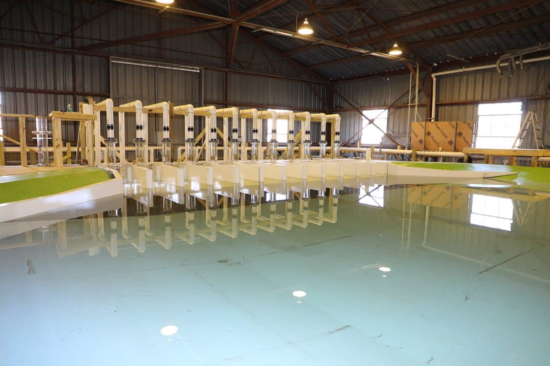 The 1:17.62 scale model was completed in March 2022 and consists of all the relevant hydraulic components required to investigate the approach flow entering the pump station, including an approach channel, wingwalls, intake bays, formed suction intakes and pump columns. The model is used to reflect the intake condition of the flow that’s approaching from the inlet channel. There are a lot of different things that could impact the intake conditions, such as how much riprap is in the water, how your inlet channel is designed, how your wing walls are angled, the width of your bays, etc.