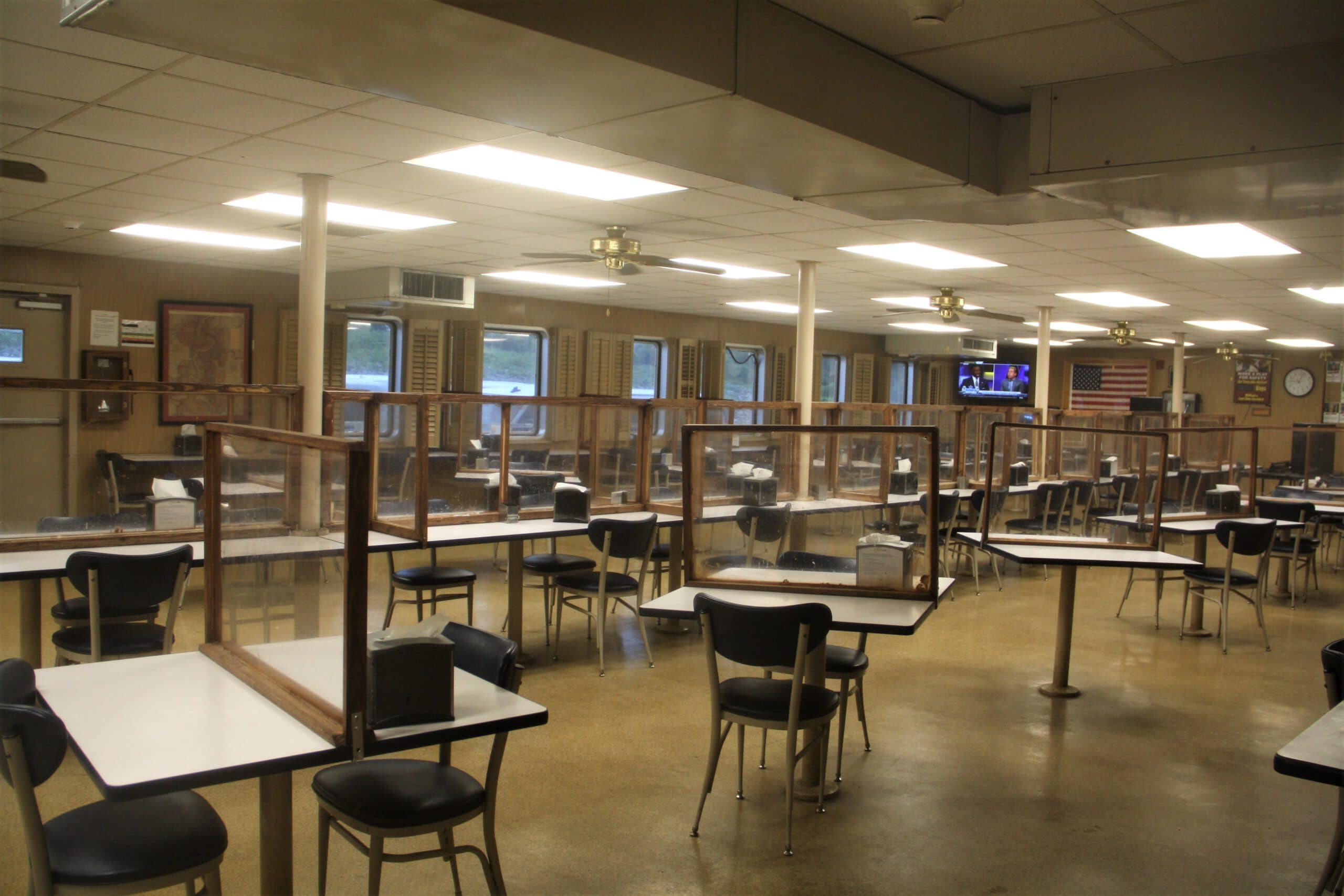 Enhanced cleaning and capacity protocol are in place in common areas on the Mat Sinking Unit (MSU) to as part of COVID-19 safety measures. Here, Plexiglass dividers built by the onboard carpentry shop serve as barriers between dining occupants. (Photo by Bucky Wall, USACE)