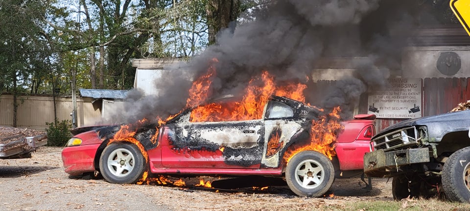 Around 1:30 p.m. a vehicle fire was reported on Redhawk Road. A red Ford Mustang was seen on fire in front of a trailer park. The flames created a plume of black smoke visible from across town.