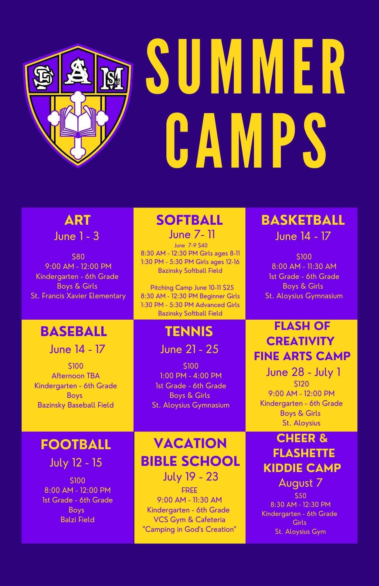The camps will include basketball, softball, baseball, art, baseball, tennis, Flash of creativity fine arts camp, football, vacation bible school, cheer and Flashette kiddie camp.