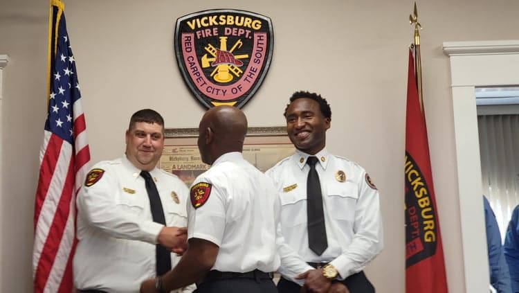 Cpt. Daniel Greer and Cpt. Tavares Hatchett are welcomed among the new ranks of the Vicksburg Fire Department. (Photo by David Day)