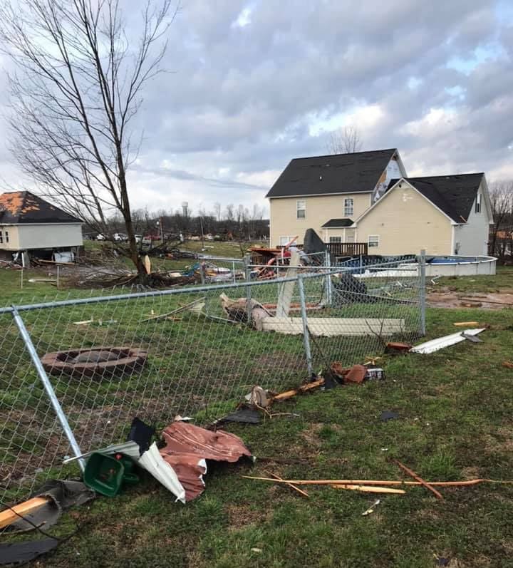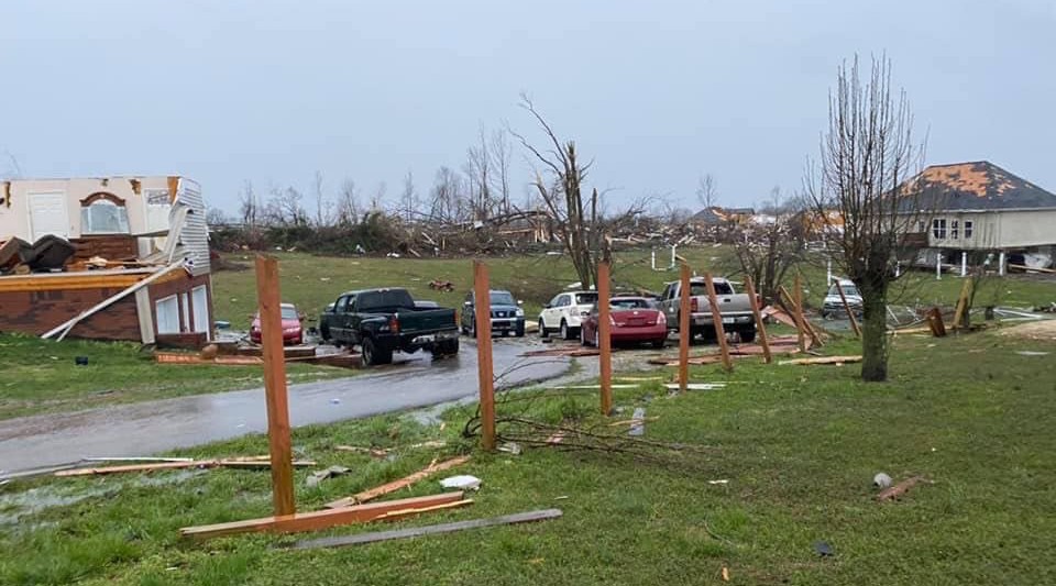 The Myers’ subdivision in Cookeville, Tenn. The Myers’ home is on the far right. What’s left of a neighbor’s house is on the left.