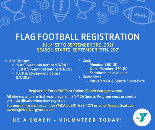 VICKSBURG, Miss. (Vicksburg Daily News) – The Vicksburg YMCA has opened registration for flag football season which will begin on September 13.