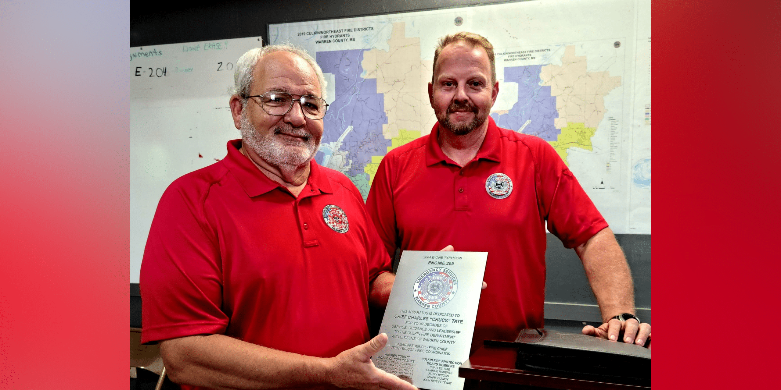 Warren County firefighter Chuck Tate has been honored by his fellow firefighters with a plaque on the newly refurbished Engine 205.