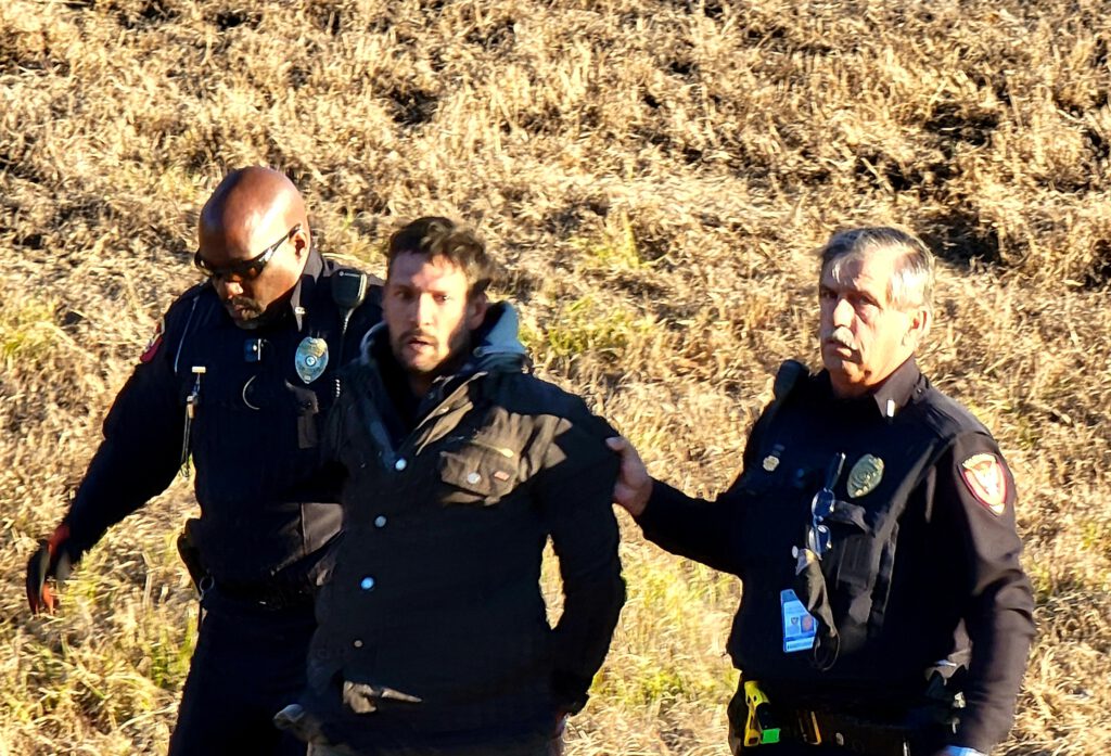 Officer Lee Williams arrived shortly thereafter and approached the man who immediately began threatening Officer Williams. In response, Williams requested a backup unit and returned to his vehicle to get his gloves as Engine 7 could be heard in the background nearing the scene along the Interstate. When firefighters arrived they ran a hose up the hill to the fire and powered up the waterline. When the firefighter picked up the hose the man positioned himself between the water hose and the fire all the while yelling at and threatening the firefighter.