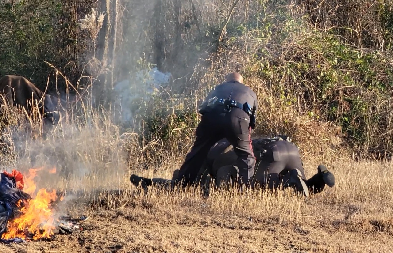 VIDEO – Desperate man starts a fire, screams at and threatens first responders and has to be taken down -VIDEO