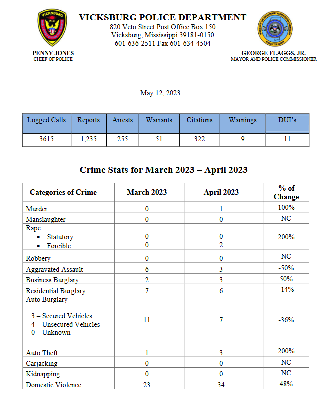 During the Board of Mayor and Aldermen meeting on Monday, the board received crime statistics from the Vicksburg Police Department for March – April 2023.