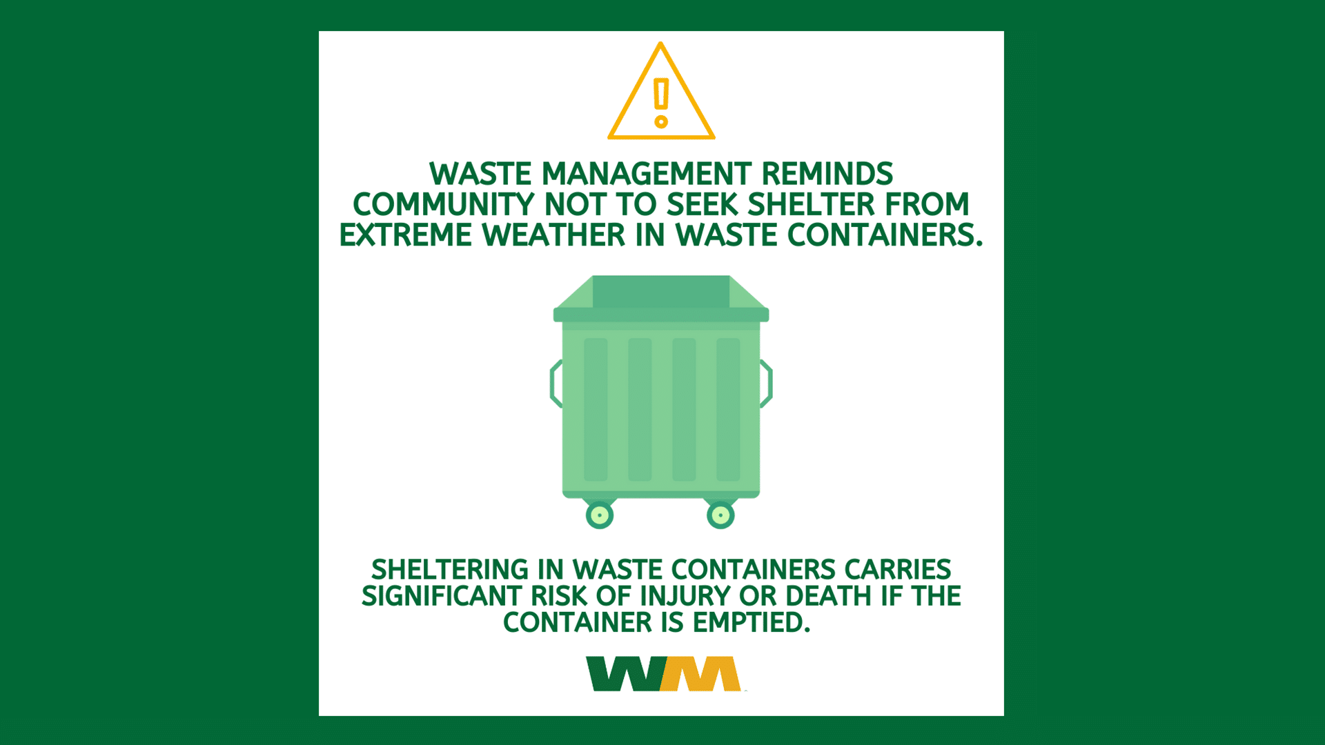 “Waste Management requests that the community please stay out of waste containers, for your safety, and for the safety of our drivers. We understand individuals may go to great lengths to seek cover from severe weather. However, if someone is inside a waste container when it is emptied, there is a significant risk of injury or death. By working with our customers and exercising additional vigilance, we hope to reduce this risk,” said Tony Franco, area safety manager.