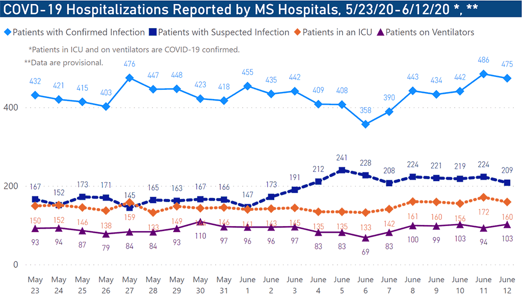 As of Friday, 475 Mississippians are hospitalized with confirmed cases of COVID-19. Another 209 patients are hospitalized with suspected infections. Of those hospitalized with confirmed infections, 160 are critically ill and in intensive care units and 103 are on ventilators.