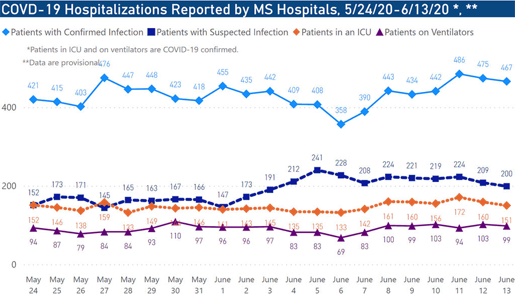 As of Sunday, 467 Mississippians are hospitalized with confirmed cases of COVID-19. Another 200 patients are hospitalized with suspected infections. Of those hospitalized with confirmed infections, 151 are critically ill and in intensive care units and 99 are on ventilators.