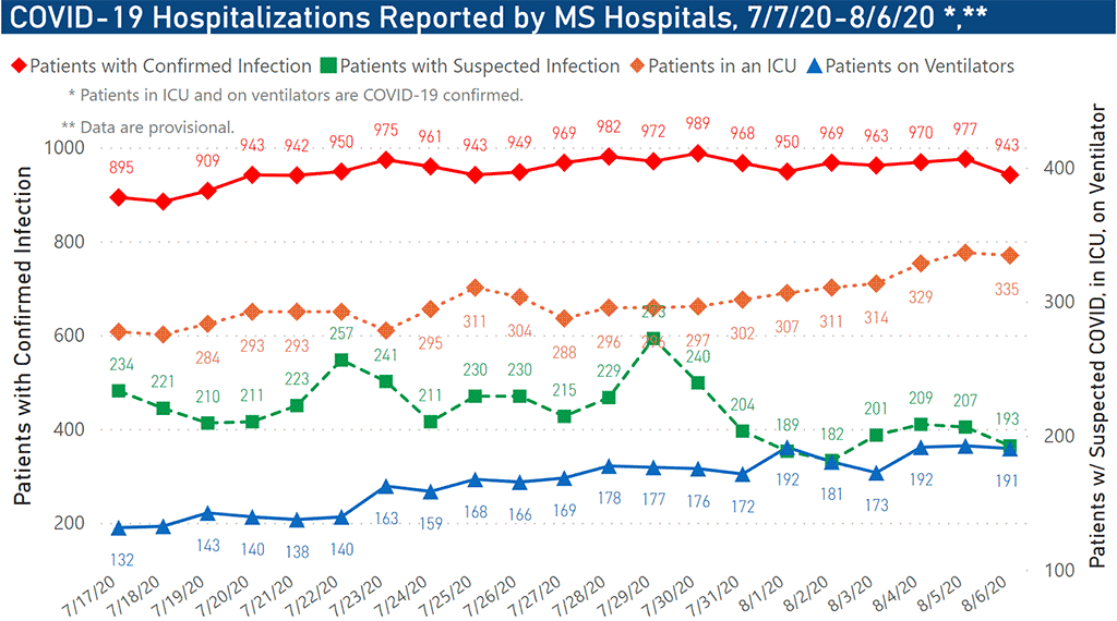 The number of Mississippians hospitalized for the virus as of 6 p.m. Thursday, Aug. 6, is 1,136. The number includes 943 with confirmed cases of COVID-19 and 193 people with suspected but unconfirmed cases. Of those with confirmed infections, 335 were critically ill and in intensive care units and 191 were on ventilators.