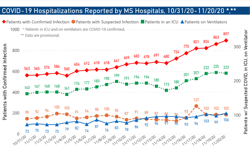 The number of Mississippians hospitalized for the virus as of 6 p.m. Friday, Nov. 20, was 1,017, about 85% of the late July peak of about 1,200. The number includes 897 with confirmed cases of COVID-19 and 102 people with suspected but unconfirmed cases. Of those with confirmed infections, 223 were critically ill and in intensive care units and 106 were on ventilators.