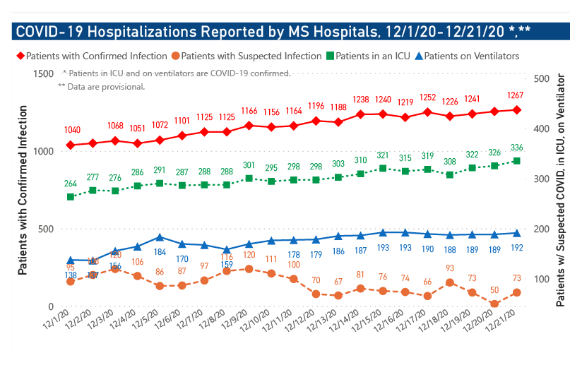 The number of Mississippians hospitalized for the virus as of 6 p.m. Monday, Dec. 21, was 1,340. The number includes 1,267 with confirmed cases of COVID-19 and 73 people with suspected but unconfirmed cases. Of those with confirmed infections, 336 were critically ill and in intensive care units and 192 were on ventilators.