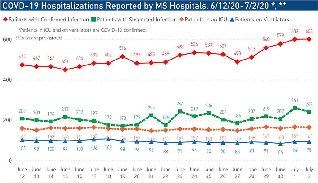 As of 6 p.m. Thursday, July 2, 845 Mississippians were hospitalized for the virus, including 603 with confirmed cases of COVID-19 and 242 people with suspected but unconfirmed cases. Of those with confirmed infections, 165 were critically ill and in intensive care units, and 95 were on ventilators.