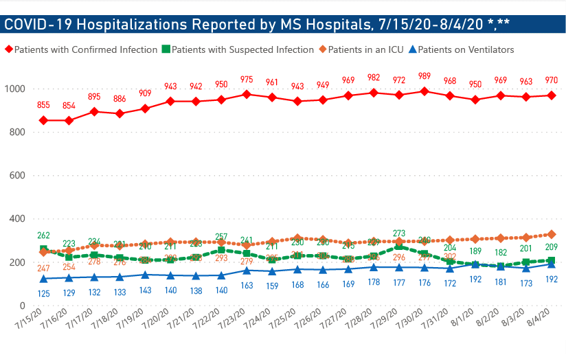 The number of Mississippians hospitalized for the virus as of 6 p.m. Tuesday, Aug. 4, is 1,179. The number includes 970 with confirmed cases of COVID-19 and 209 people with suspected but unconfirmed cases. Of those with confirmed infections, 329 were critically ill and in intensive care units and 192 were on ventilators.
