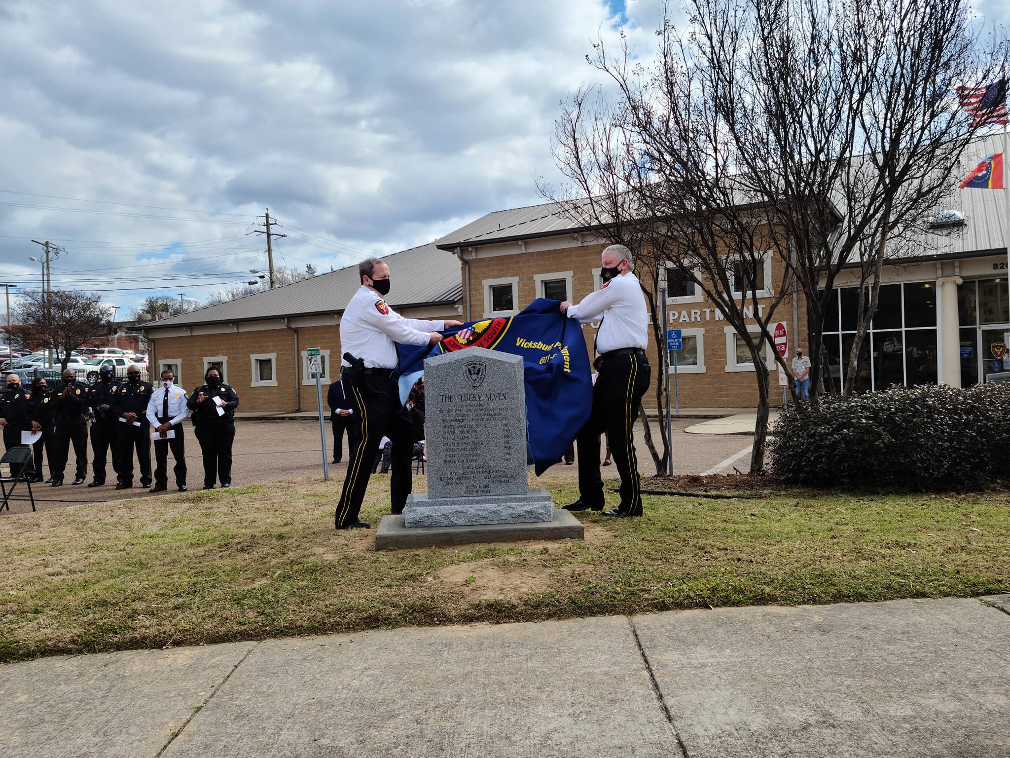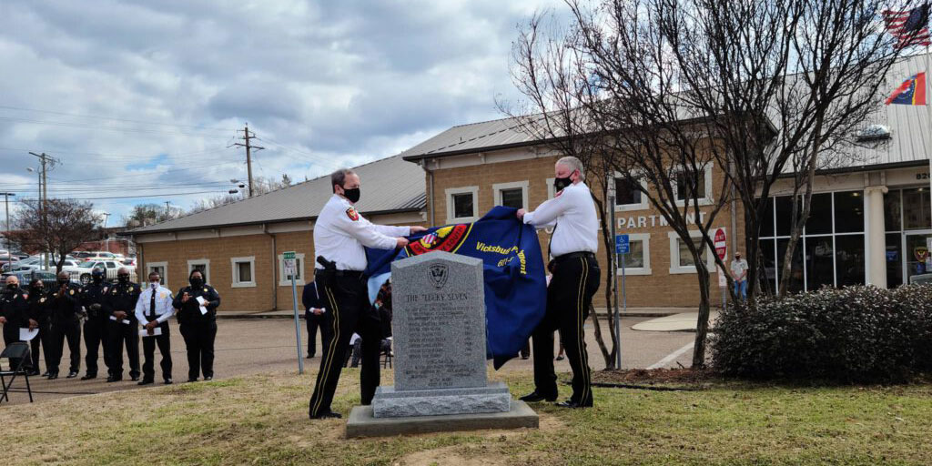 Captain Mike Bryant (left) and Deputy Chief Bobby Stewart (right) of the Vicksburg Police Department reveal the “Lucky Seven” monument during a historic local ceremony. (Photo by David Day)