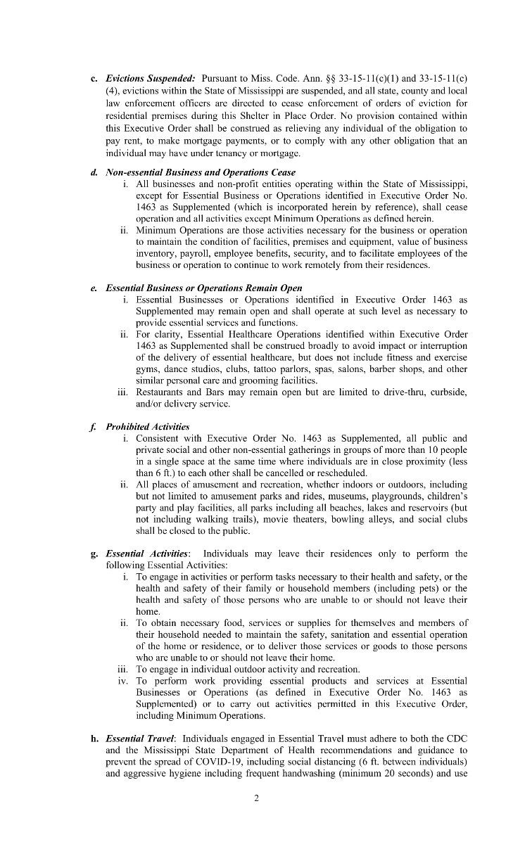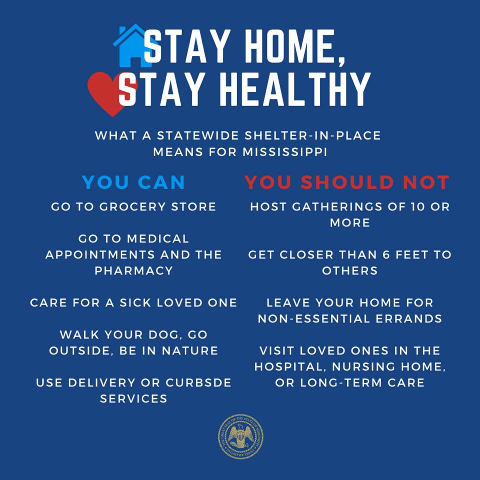 - All residents of Mississippi must stay at home or in their current place of residence.