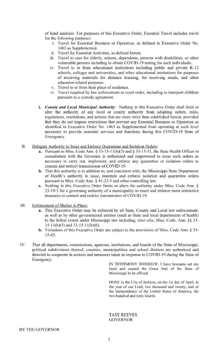 Mississippi Gov. Tate Reeves signed a statewide Shelter in Place executive order on Wednesday, April 1. That order goes into effect today, Friday, April 3, at 5 p.m. and is effect until Monday, April 20, at 8 a.m.