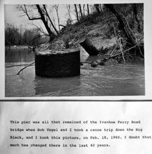 In the late 1920s there was a log jam under the bridge, and the supervisors (I don’t know from which county) decided to dislodge the logs with dynamite. The plan worked, but they failed to take into consideration the fate of the bridge. Only a pier was left, and Daddy said he hoped it would always stand as a testimonial to the intelligence of the board of supervisors.