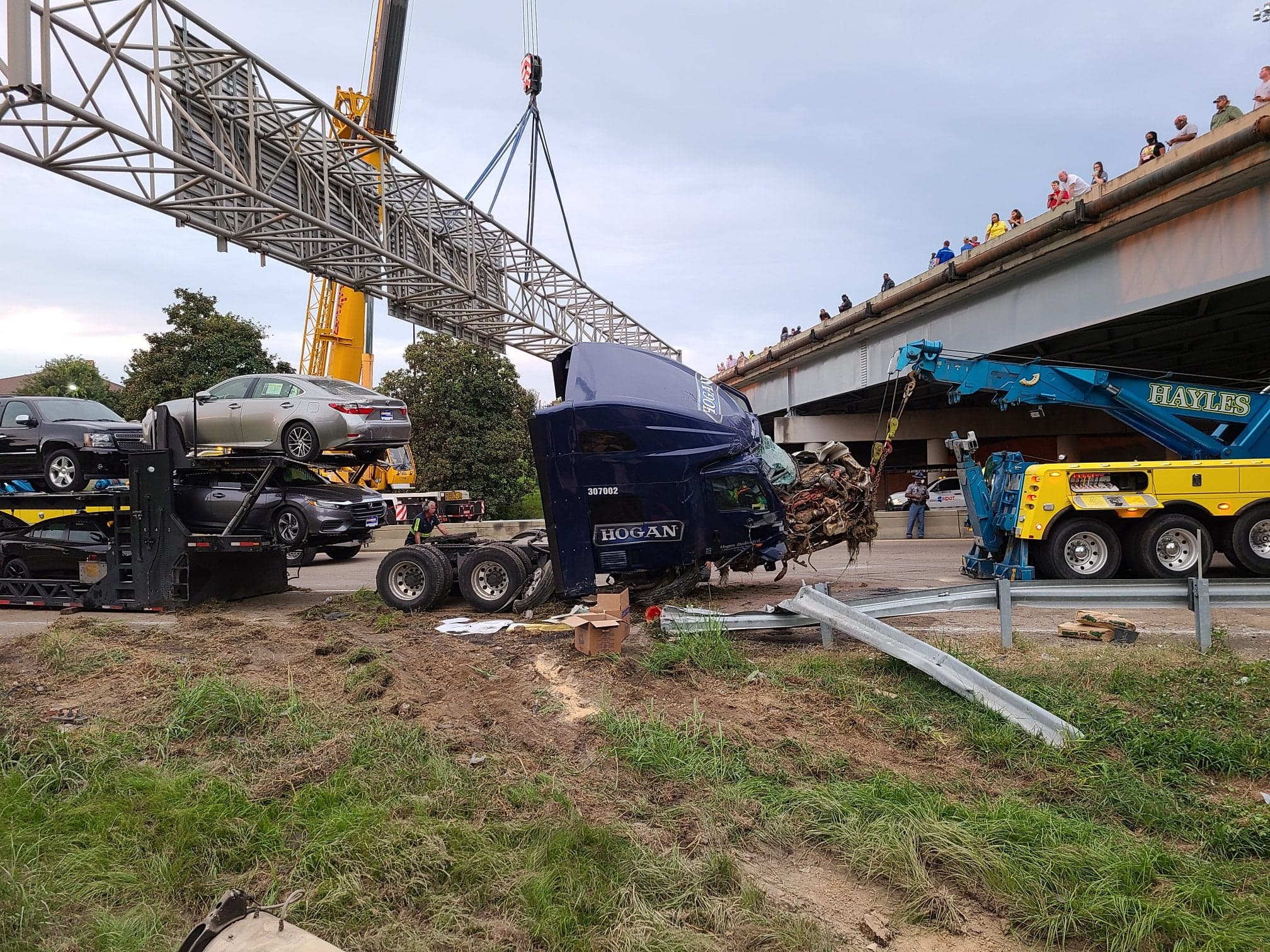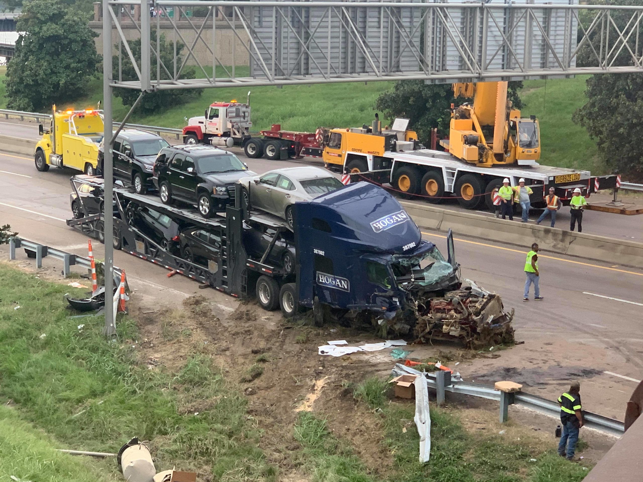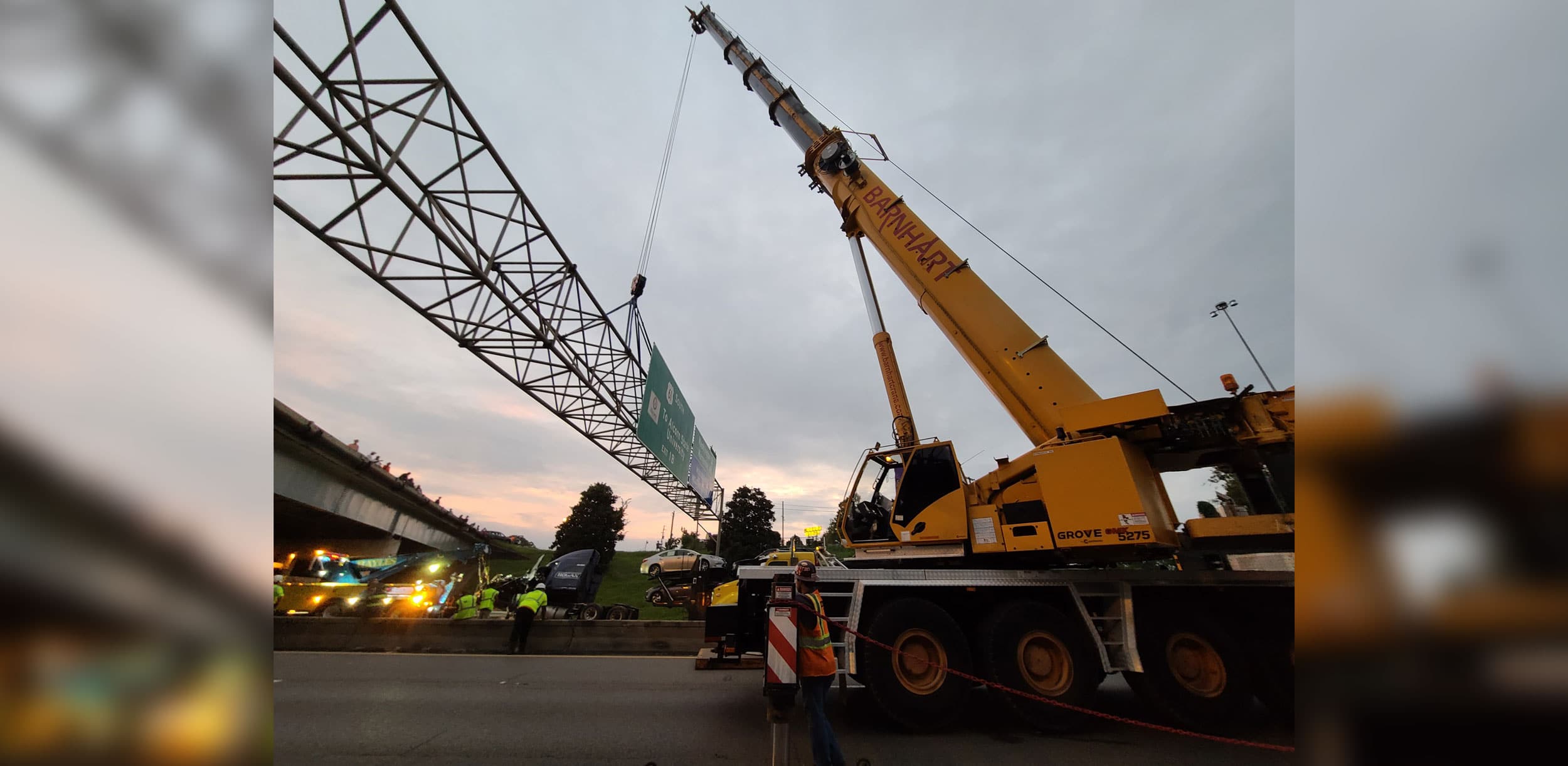 While inconvenient for commuters, this work is necessary to ensure the safety of everyone driving under the truss. The impact of the car hauler knocked one beam completely off and dislodged the other, leaving the sign truss in a perilous position.