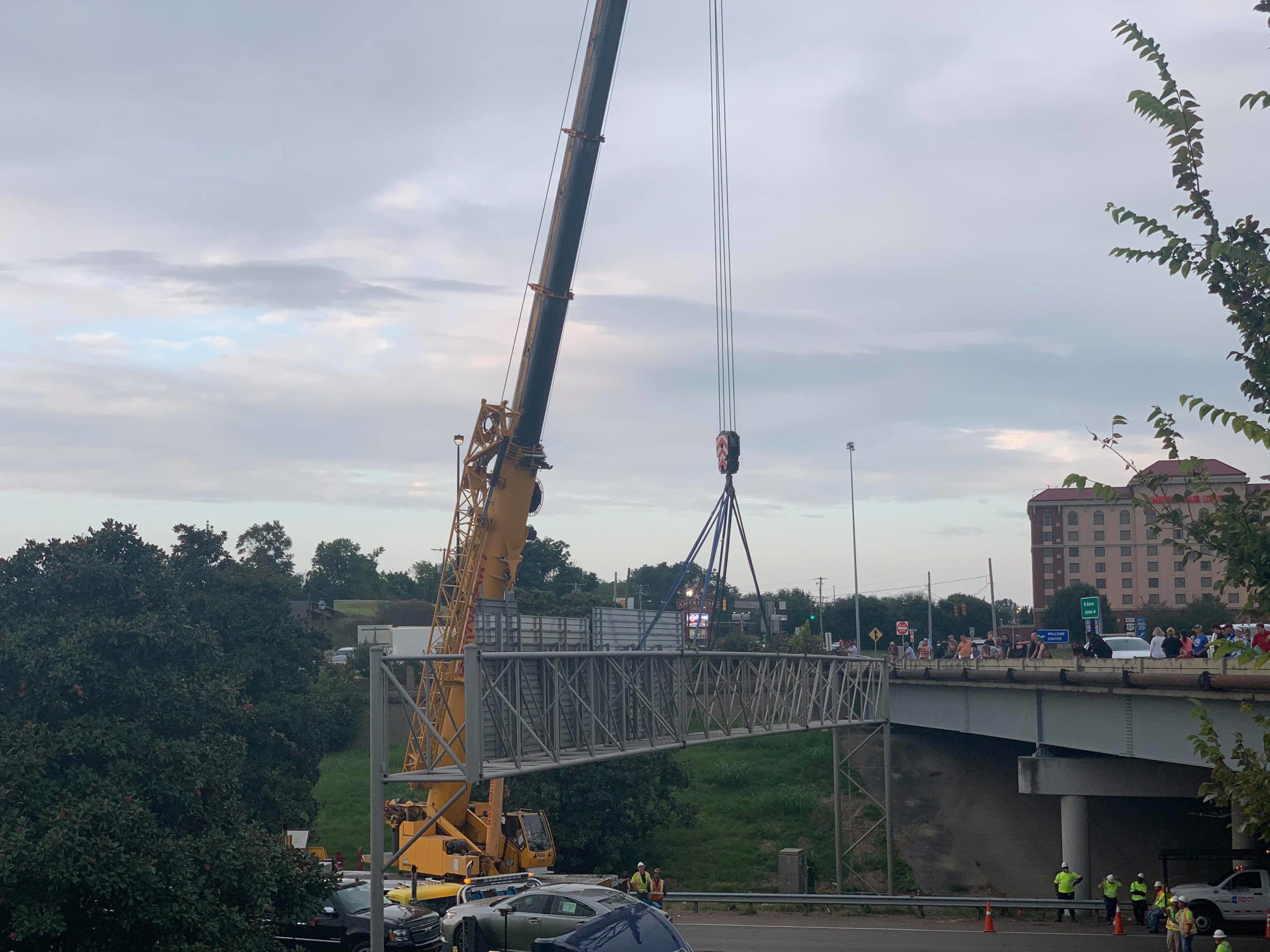As daylight dwindles, crews continue to work to safely remove the damaged sign truss from the foot of the Mississippi River bridge on U.S. Interstate 20.